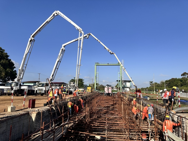 10月28日,苏里南萨拉玛卡运河船闸及水闸修复项目顺利完成闸室墙首层混凝土浇筑作业,标志着项目建设取得了阶段性成果。 本次浇筑部位为船闸闸室墙体结构,墙体总长87.2米,高度约2.4米。面对结构体量大、钢筋密集、模板支设复杂等技术难点,以及高温高湿、作业面狭窄等现场条件,项目部科学制定施工方案,合理调配资源,严格执行分层振捣等关键工序,经过近8小时的连续作业,顺利完成混凝土浇筑任务,混凝土表面平整密实,各项技术指标均符合设计规范要求。 该节点工序的顺利完成,为后续闸室墙全面施工及项目整体推进奠定基础。下一步,项目部将秉持精益求精的施工理念,确保工程优质高效推进。