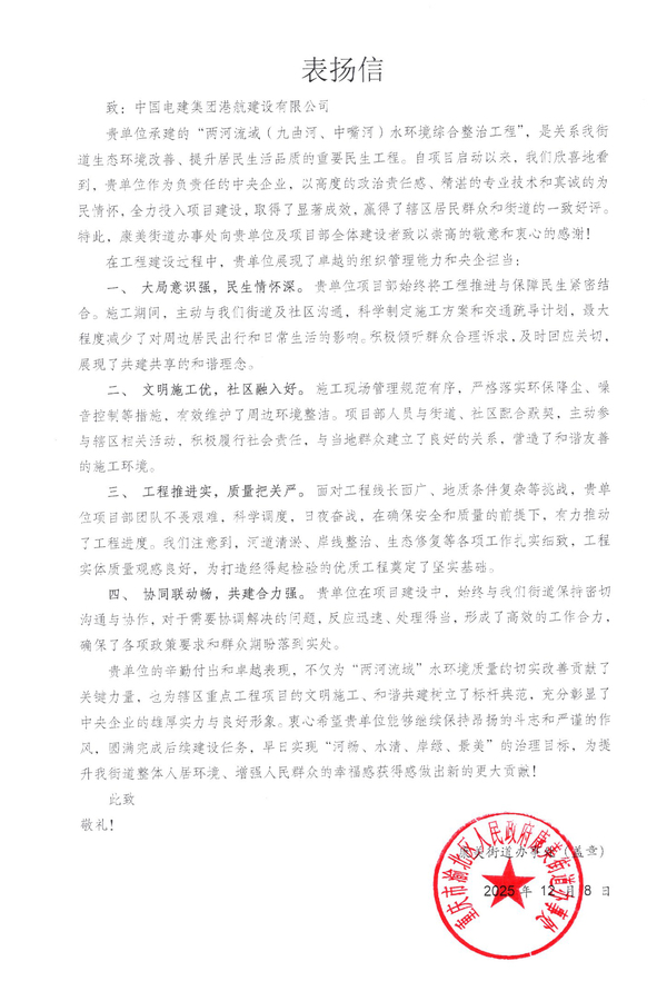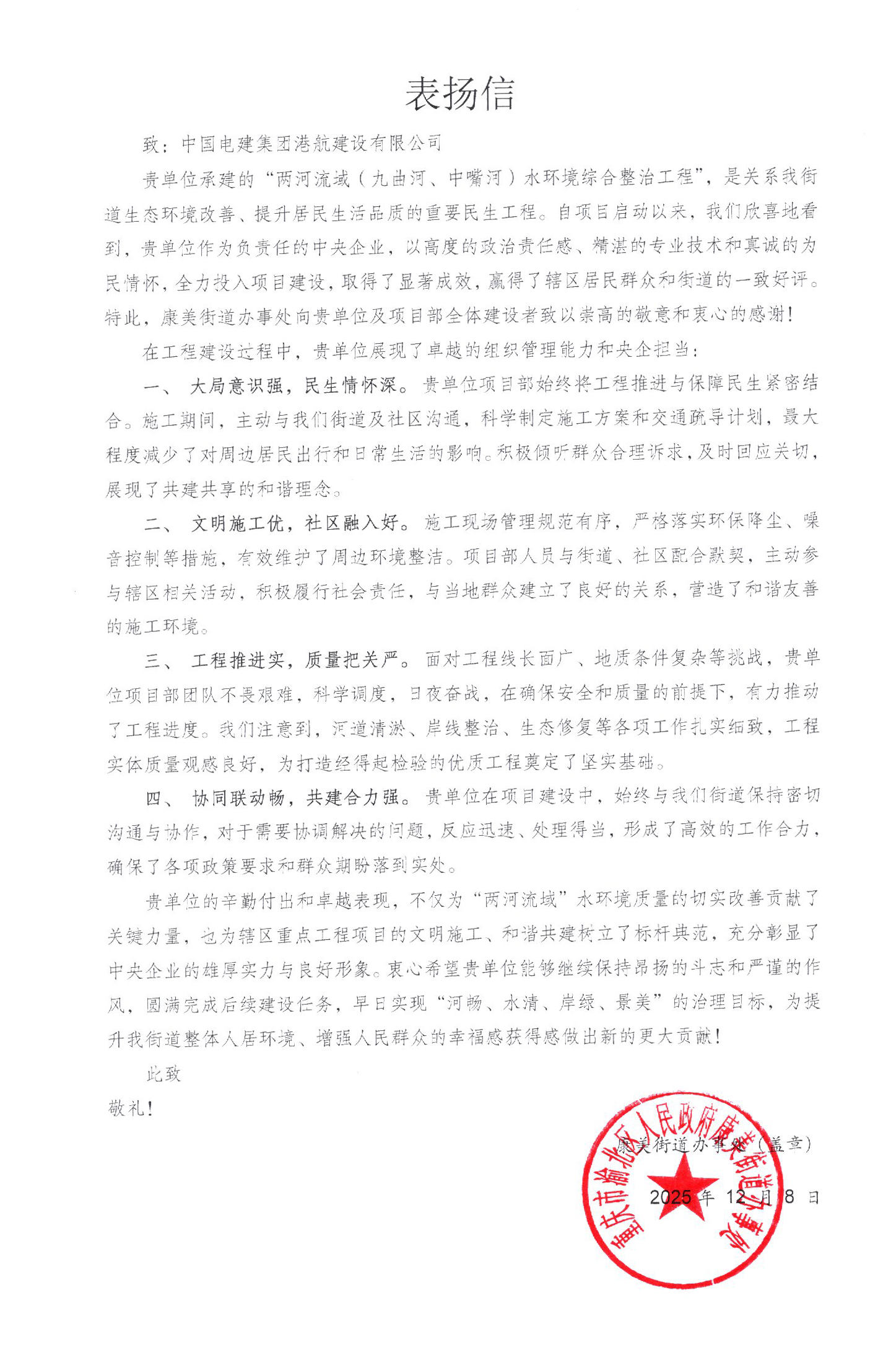 12月8日,公司承建的重庆两河流域(九曲河、中嘴河)水环境综合整治工程收到康美街道办事处发来的表扬信,信中对项目团队在工程建设中的优异表现予以充分肯定。 信中指出,项目自启动以来,始终以高标准、严要求推进建设,展现出央企的大局意识与民生情怀。项目部积极与街道、社区沟通协调,科学优化施工组织,最大限度降低对群众生活的影响。在施工过程中,团队坚持文明施工,严格落实环保措施,主动融入社区共建,营造了和谐友好的建设氛围。面对线路长、地质复杂等诸多挑战,项目团队迎难而上、昼夜奋战,在稳步推进工程进度的同时严把质量关。此外,项目部与街道建立了高效顺畅的协同机制,响应迅速、配合紧密,共同推动问题解决,形成了有力的共建合力。 该工程是重庆两江新区提升生态环境和居民生活质量的重点民生工程。目前小溪沟、龙凼子、柳吊溪等子项工程相继完工,通过实施河床整治、生态护岸等工程,河道行洪能力与生态品质得到有效提升,区域水环境与人居环境实现实质性改善。下一步,项目团队将继续践行绿色发展理念,为实现“河畅、水清、岸绿、景美”治理目标、建设美丽重庆贡献电建力量。 |